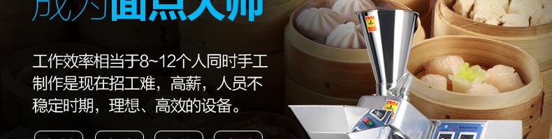 名稱XZ-87包子機 電源220/380V(見機器名牌) 功率2.4kw 產量0-3600個/小時 尺寸1600*720*1600mm 重量390kg 規格20-150克/個 其他