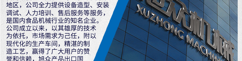 廣州旭眾食品機(jī)械有限公司是一家集科研開發(fā),生產(chǎn)設(shè)計(jì),營(yíng)銷服務(wù)為一體的現(xiàn)代化生產(chǎn)企業(yè)。現(xiàn)代化生產(chǎn)車間,精湛制造技術(shù),所產(chǎn)機(jī)械歷經(jīng)市場(chǎng)重重考驗(yàn),不斷贏得海內(nèi)外客戶的贊譽(yù)。