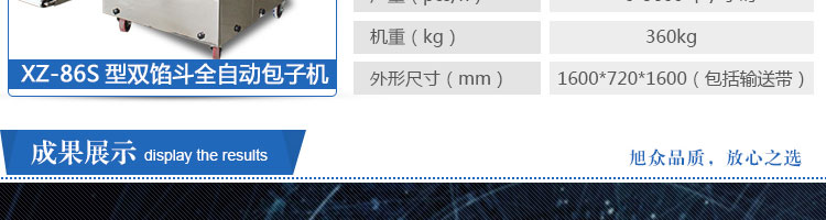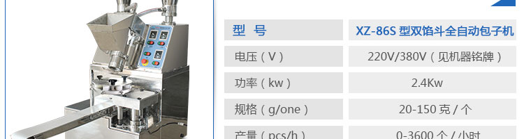 名稱XZ-86S型雙餡斗全自動包子機 電源220/380V(見機器名牌) 功率2.4kw 產量0-3600個/小時 尺寸1600*720*1600mm(包括輸送帶) 重量360kg 規格20-150克/個 其他