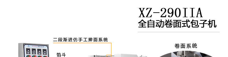 XZ-290IIA包子機,可生產各種不同餡料的包子、各式包餡食品,如豆沙包、南瓜餅、肉包、小籠包、水晶包等幾十種包餡制品。適用于個體戶、食品廠、學校等單位食堂。可滿足不同客戶群體。免費提供工藝技術。