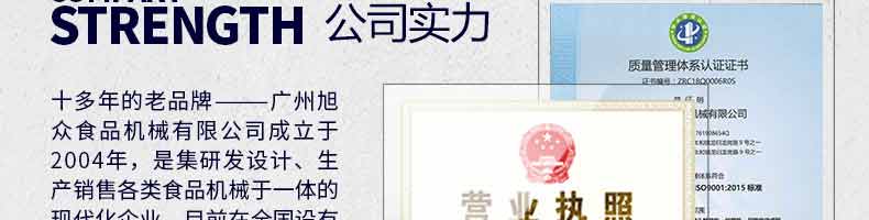 廣州旭眾食品機(jī)械有限公司是一家集科研開(kāi)發(fā),生產(chǎn)設(shè)計(jì),營(yíng)銷服務(wù)為一體的現(xiàn)代化生產(chǎn)企業(yè)?,F(xiàn)代化生產(chǎn)車間,精湛制造技術(shù),所產(chǎn)機(jī)械歷經(jīng)市場(chǎng)重重考驗(yàn),不斷贏得海內(nèi)外客戶的贊譽(yù)。