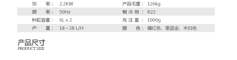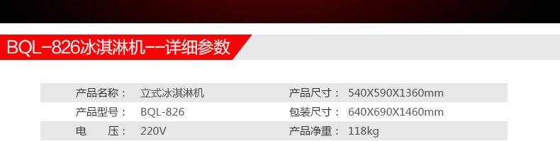 名稱BQL-826立式冰淇淋機 電源220V 功率2.2kw 產量18-28L/h 尺寸 540*590*1360mm 重量118kg 規格 其他