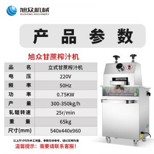 名稱立式甘蔗機 電源220V/50Hz 功率0.75kw 產量300-350kg/h 尺寸外形尺寸540*440*960mm 重量65kg 規格 其他