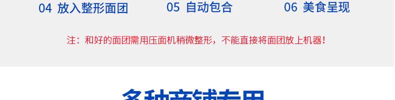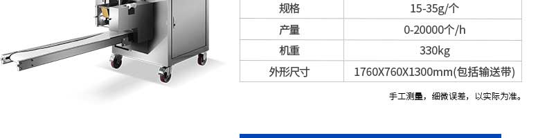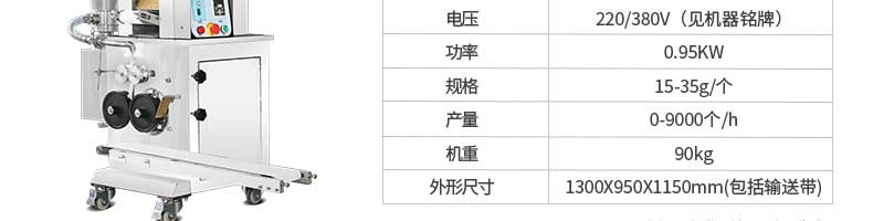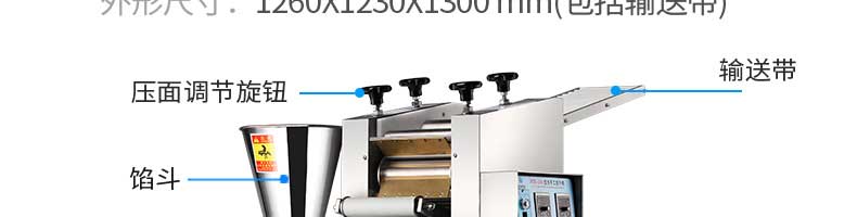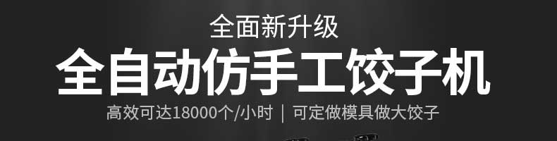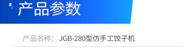 名稱JGB-280仿手工餃子機 電源220/380V 功率1.75kw 產量0-18000個/小時 尺寸1260*1230*1300mm 重量270KG 規格 其他