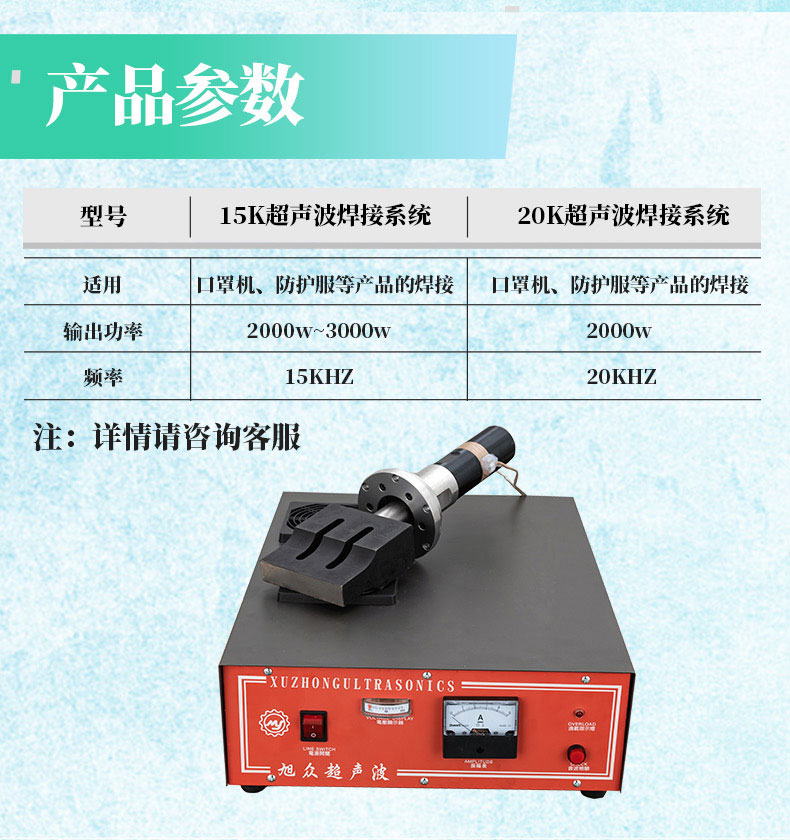 名稱口罩機15K/20K超聲波系統 電源 功率2000w-3000w 產量詳情咨詢13113134411 微信13113134411蔣經理 尺寸詳情咨詢13113134411 微信13113134411蔣經理 重量詳情咨詢13113134411 微信13113134411蔣經理 規格 其他頻率 15KHZ-20KHZ