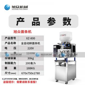 名稱XZ-800全自動鮮面條機 電源220V 功率電機功率:11KW 產量制面能力:200食/h 尺寸670X750X1780mm 重量188kg 規格聯系銷售員 其他存儲容量:30kg